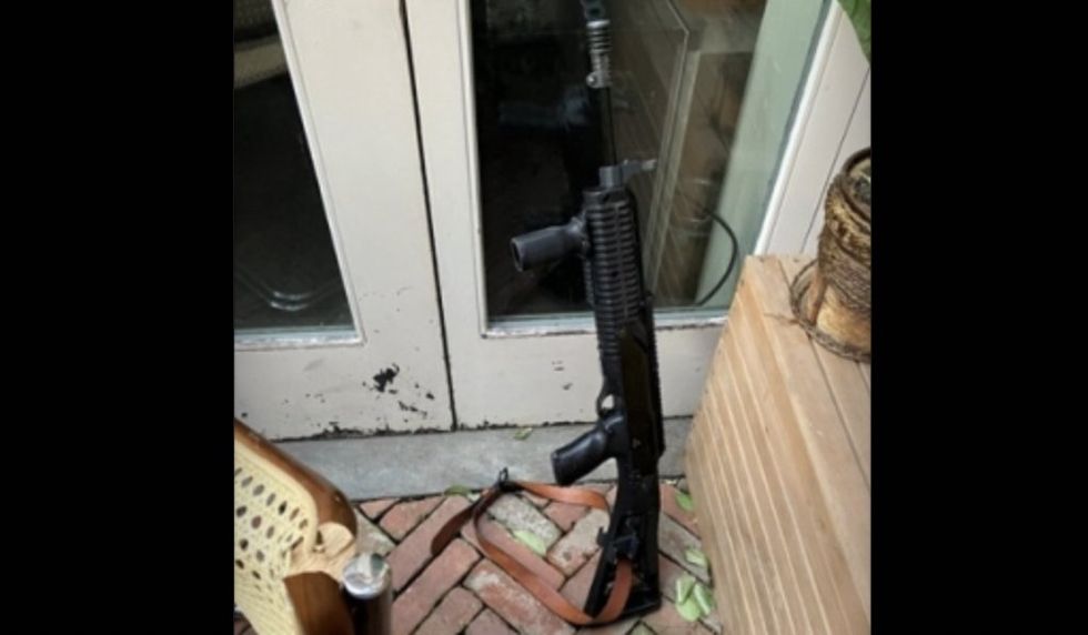 While running from his car, the suspect threw the gun into an adjacent wooded area, after which officers took him down to the street.